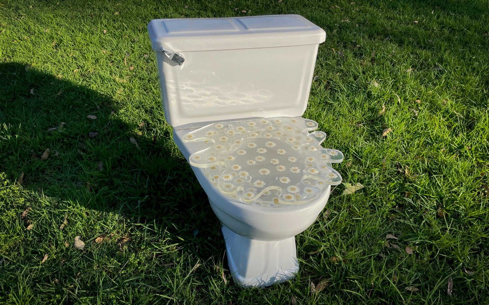 Fake bowl of spaghetti in a light wooden toilet seat. I call this a collage toilet seat.
